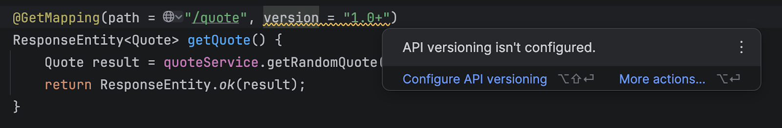 IntelliJ IDEA detects this automatically. The IDE checks whether versioning is configured in your app, identifies whether you’re using a property or the ApiVersionConfigurer class, and even warns you if something’s off. If you forgot to enable versioning, the IDE doesn’t just underline the issue – it tells you how to fix it.