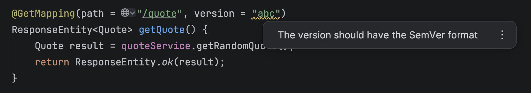 And yes, you can Ctrl+Click on the version in the @GetMapping annotation to jump straight to your configuration code. The IDE also checks that your version values follow standard SemVer rules.