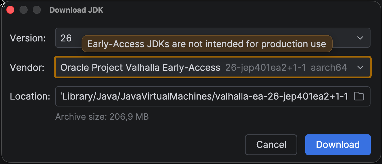 Note that you can also download early access builds from inside IntelliJ IDEA. For example, Java 26 also introduced a new build of Project Valhalla, which is also available for download.