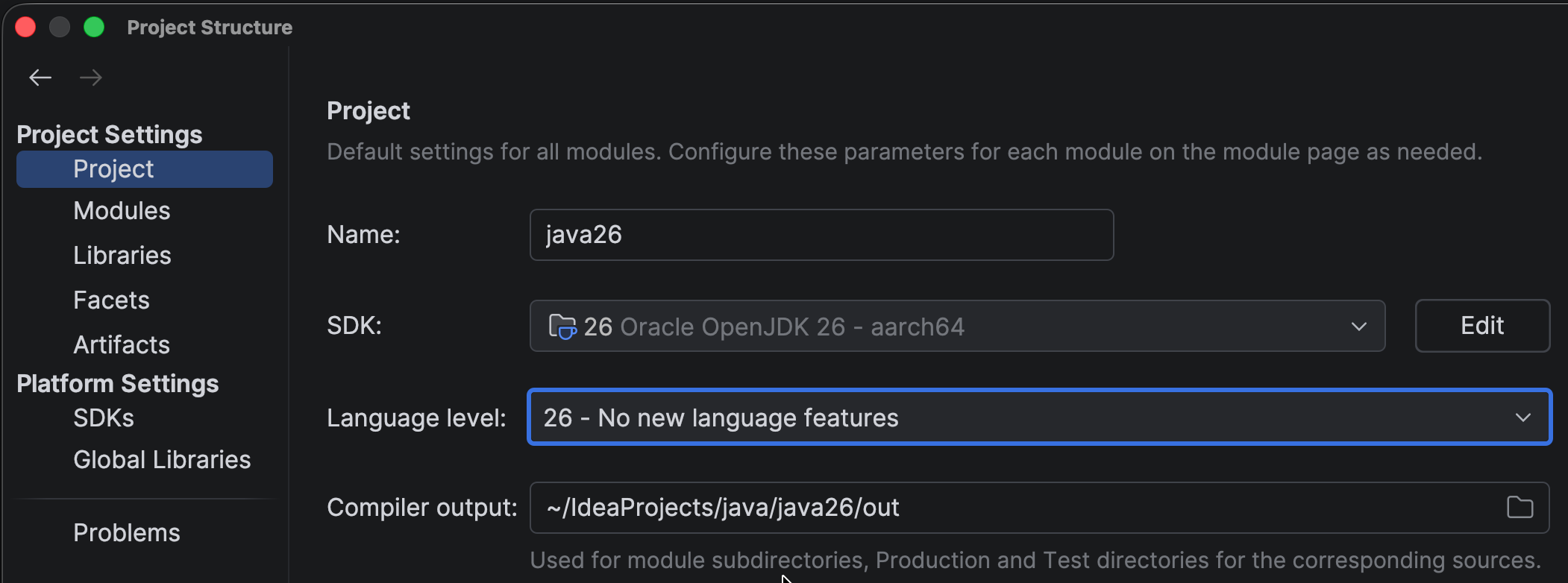 Make sure to configure IntelliJ IDEA to use the right language level. To use Java 26 stable features, set Language level to 26 – No new language features. As mentioned, Java 26 introduces no new stable language features, hence this description.
