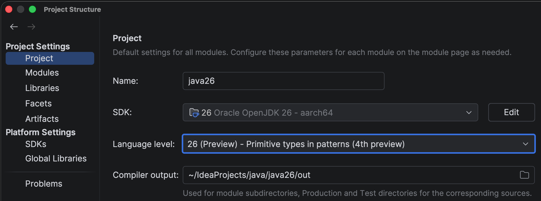 To try out preview features, set Language level to 26 (Preview) – Primitive types in patterns (Fourth preview). Setting the right language level means that IntelliJ IDEA will show support for this language level in the editor, including inspections and quick-fixes. Usage of preview features will be highlighted as such, as you might not want to use preview features in production code yet.