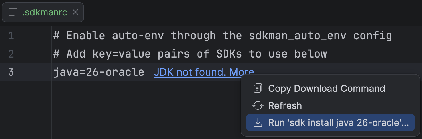 If you use SDKMAN! or asdf to manage your JDKs, IntelliJ IDEA can read the .sdkmanrc or .tool-versions file in your project and configure the JDK automatically when you open the file. For example, if you are using SDKMAN! and the JDK version specified in the .sdkmanrc file is not yet installed, an inlay hint will appear in the file, allowing you to download it directly from the IDE by running the relevant SDKMAN! command.