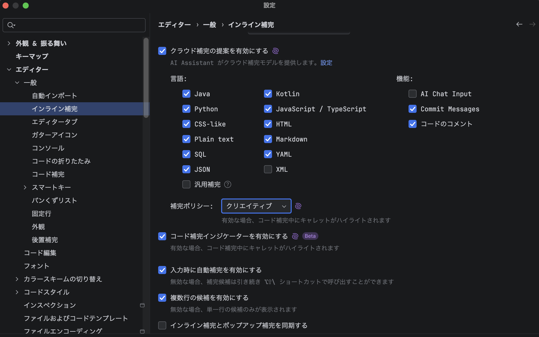 「補完ポリシー」は エディター > 一般 > インライン補完から変更できます。