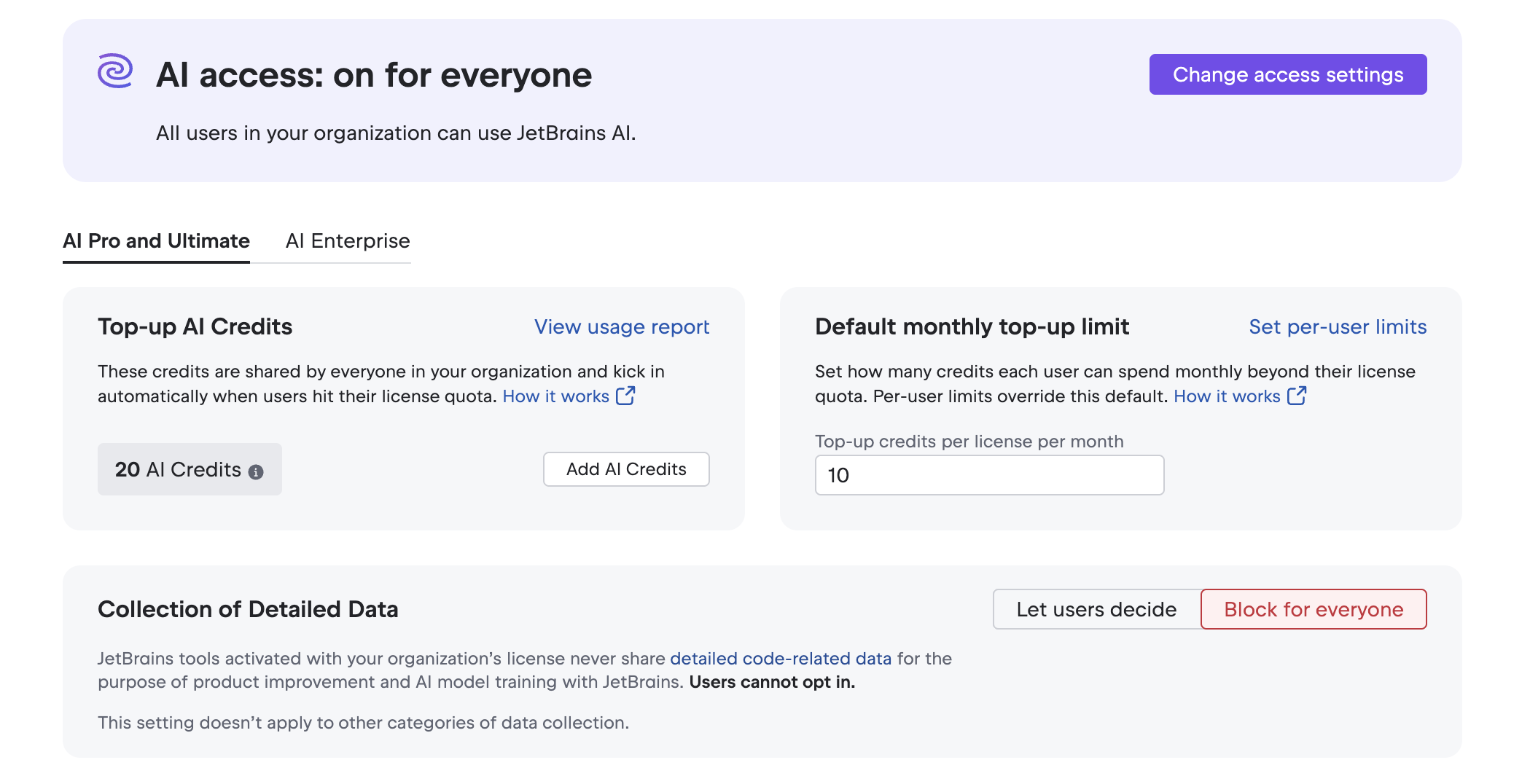 AI management(AI 管理): JetBrains AI の使用可否、クレジットの割り当て、そして利用状況の可視化を行います。詳細は以下をご覧ください。