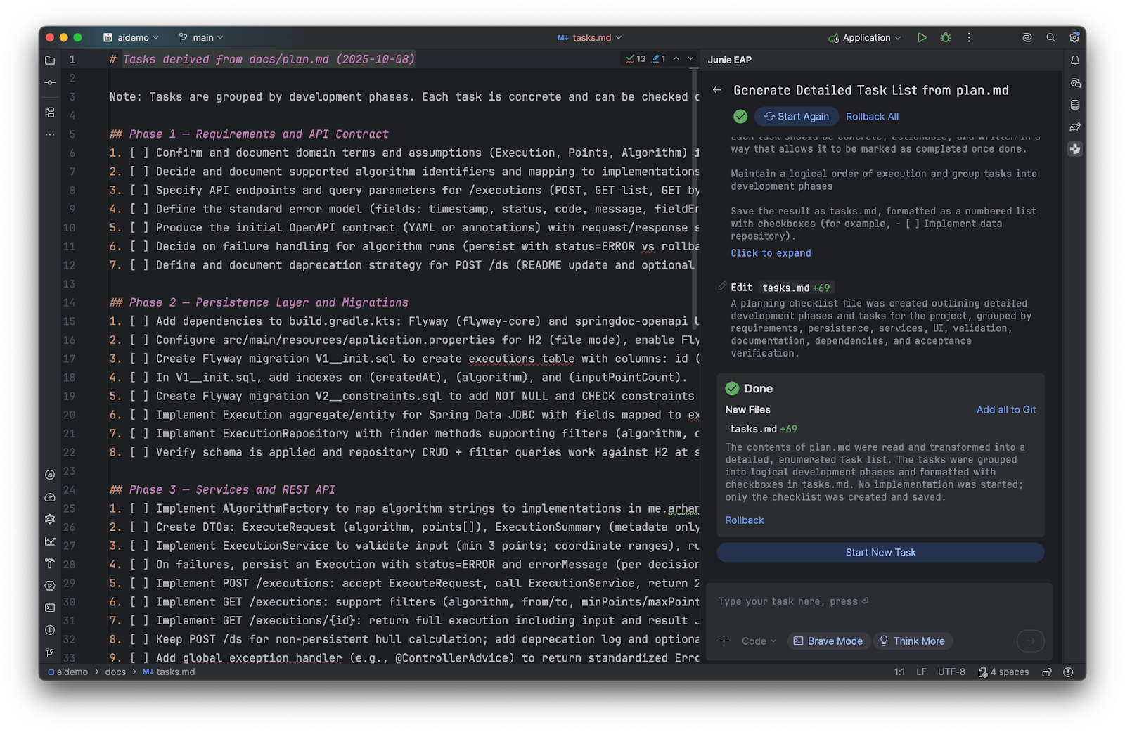 This file becomes your control panel. It gives you a persistent, external record of what’s happening, independent of Junie’s internal context. You can review, reorder, or refine tasks at any time. You can also tell Junie to complete the next task, mark it as done, and then stop.