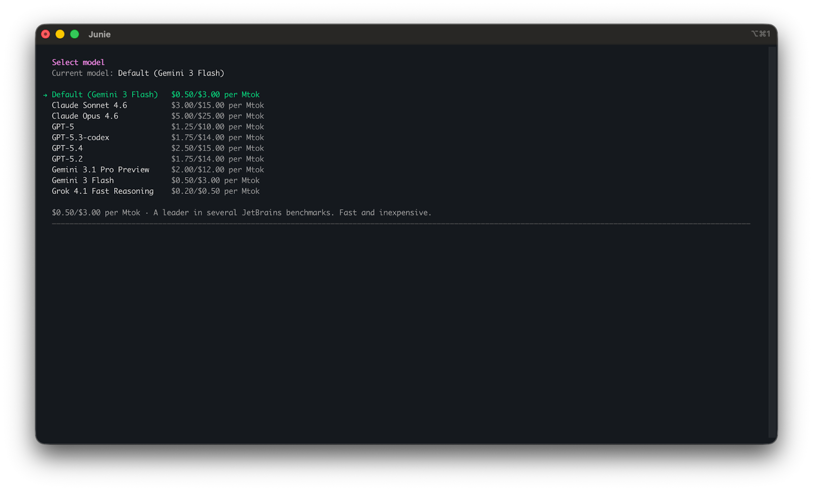 Note: To help you get started, we’re offering free access to Gemini 3 Flash for one week. It’s enabled by default, so you can install Junie CLI and begin using it right away at no cost. After the week, standard pricing applies.