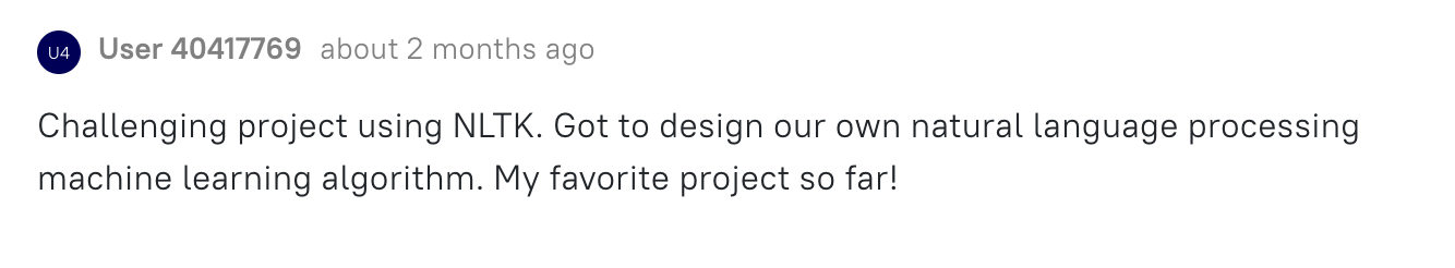 머신러닝이 어떻게 작동하고 그 뒤에 숨겨진 비밀이 무엇인지 궁금하다면 이 프로젝트를 시작해보세요. 이 프로젝트에서는 시퀀스에서 이전 단어 및 통계 모델을 만드는 데 사용되는 데이터를 기반으로 문장에서 다음 단어를 예측할 수 있는 프로그램을 만듭니다. 학습자는 자연어 처리 방식을 더 깊이 이해할 수 있기 때문에 이 프로젝트를 좋아합니다.