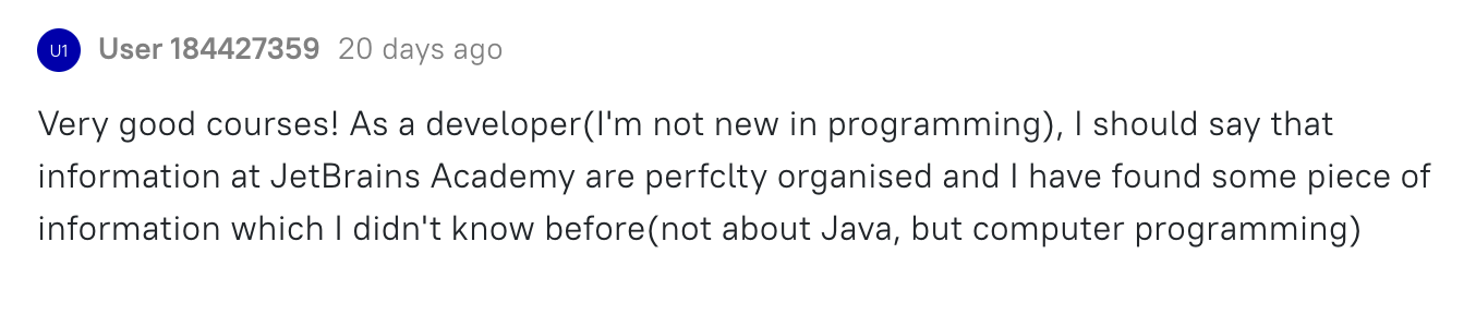 자만하지는 않지만 저희 팀은 2021년에 기대 이상을 해냈습니다. 78개의 새 프로젝트를 생성하고 424개의 새 교육 주제를 게시했습니다. 학습 커뮤니티 참여자는 JetBrains Academy에 178,000개 이상의 댓글을 남겼으며 이는 저희에게 큰 의미입니다. 커뮤니티 여러분은 서로 버그를 찾고, 어려운 작업을 해결하고, 힌트를 공유하고, 조언을 구하고 지원합니다. 우리 커뮤니티가 얼마나 강력해졌는지를 보면 그저 놀랍고 감사할 따름입니다.