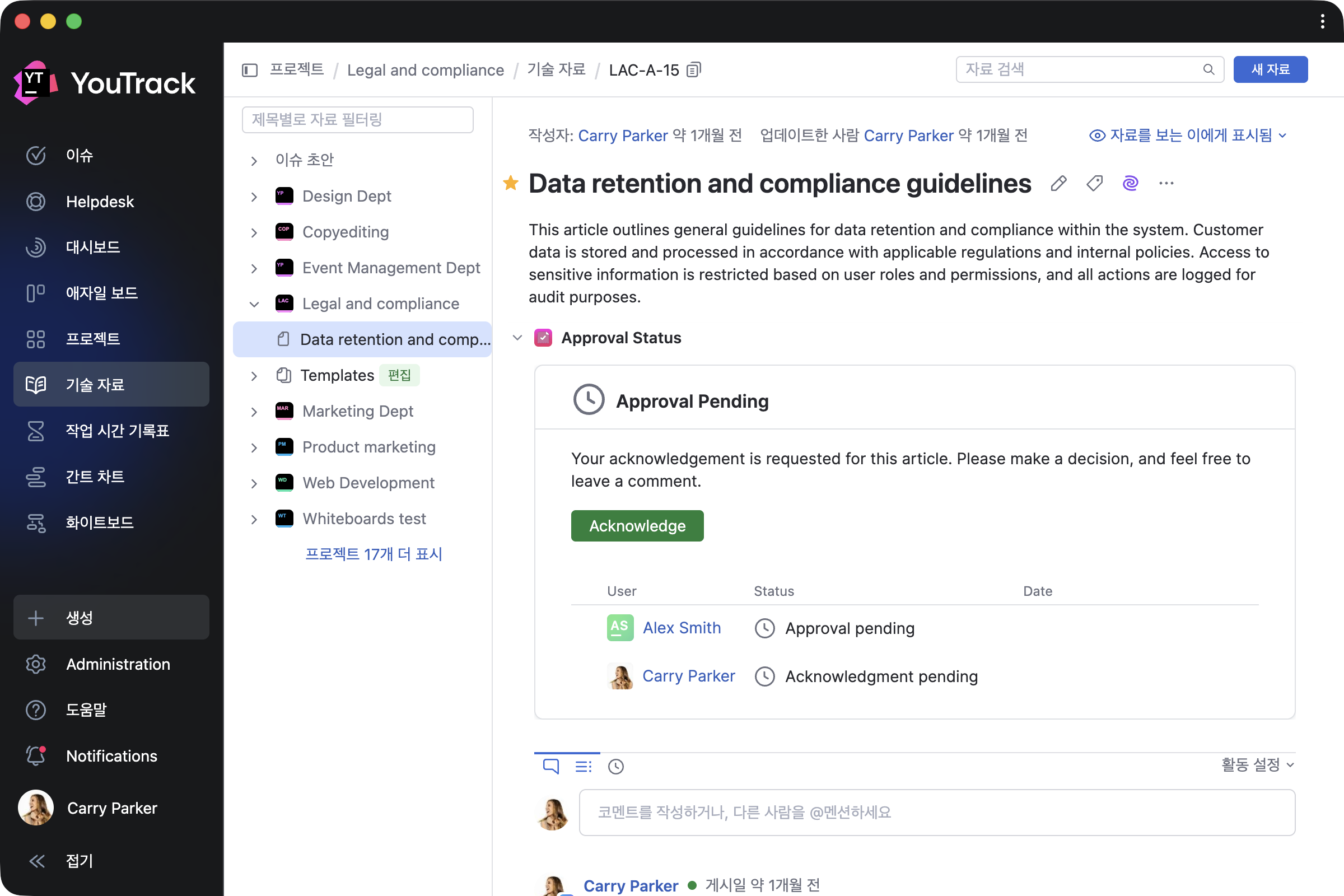 Article Approval(twenty20 개발)은 팀이 지식 베이스 내에서 승인 워크플로를 직접 관리할 수 있도록 지원하는 유료 앱입니다. 자료마다 승인자와 확인자를 초대하고, 마감일을 설정하며, 승인 상태를 추적할 수 있습니다.