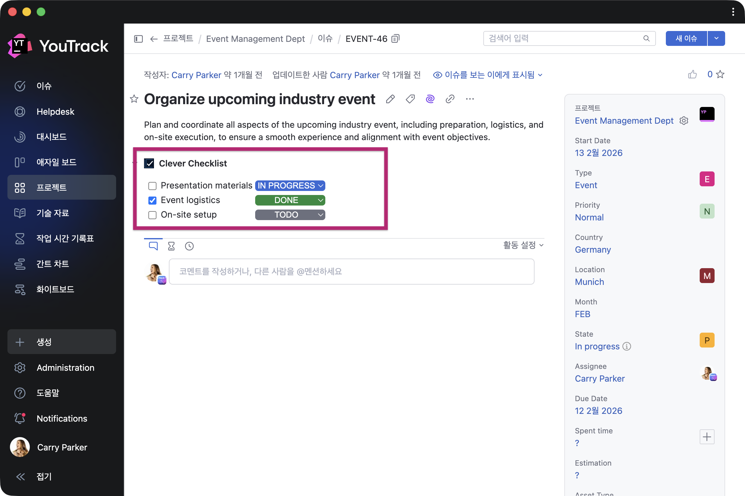 YouTrack Cloud를 사용 중인 경우 JetBrains의 유지보수 일정에 따라 사용자의 YouTrack이 YouTrack 2026.1로 자동 업그레이드됩니다.