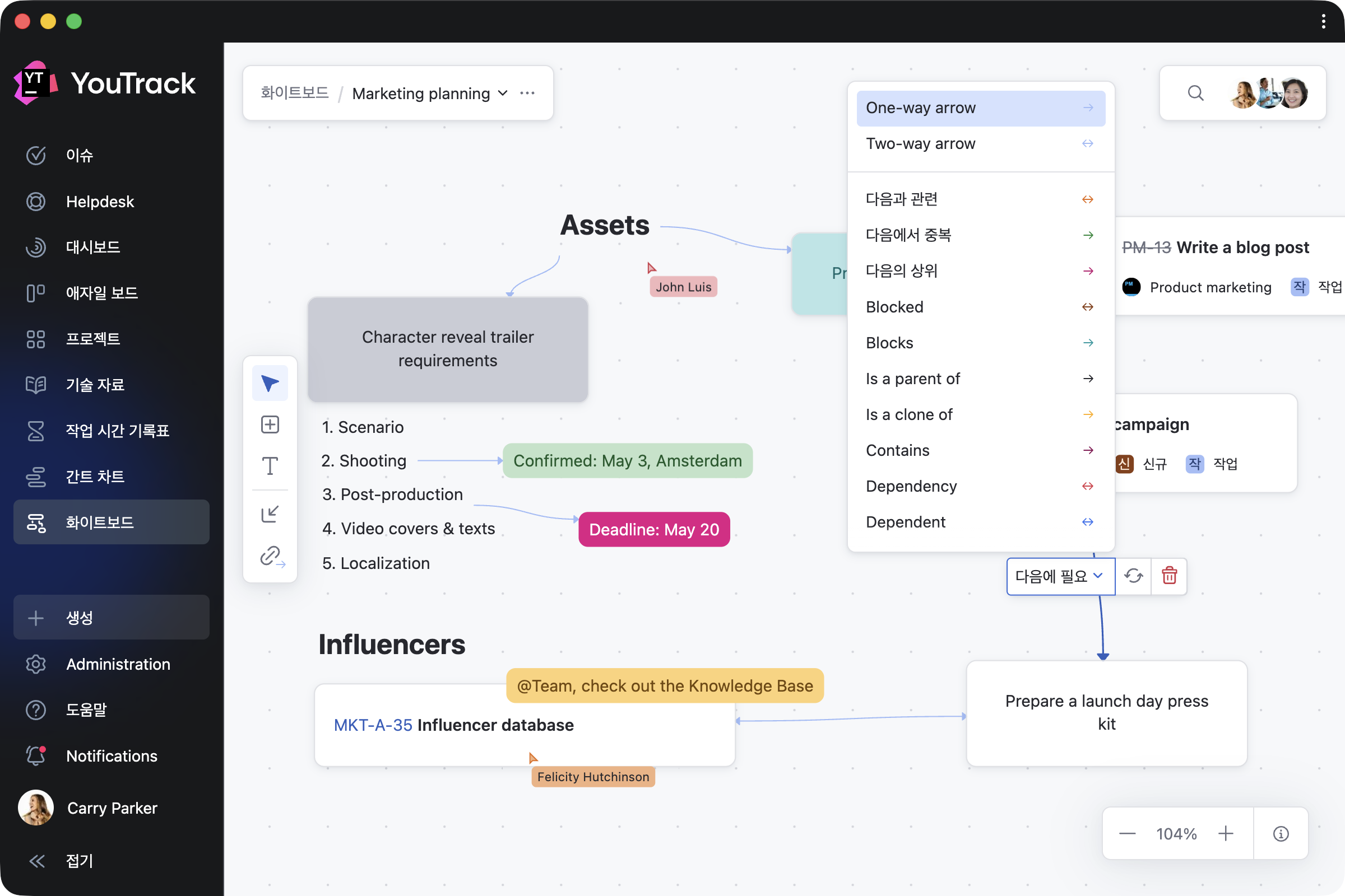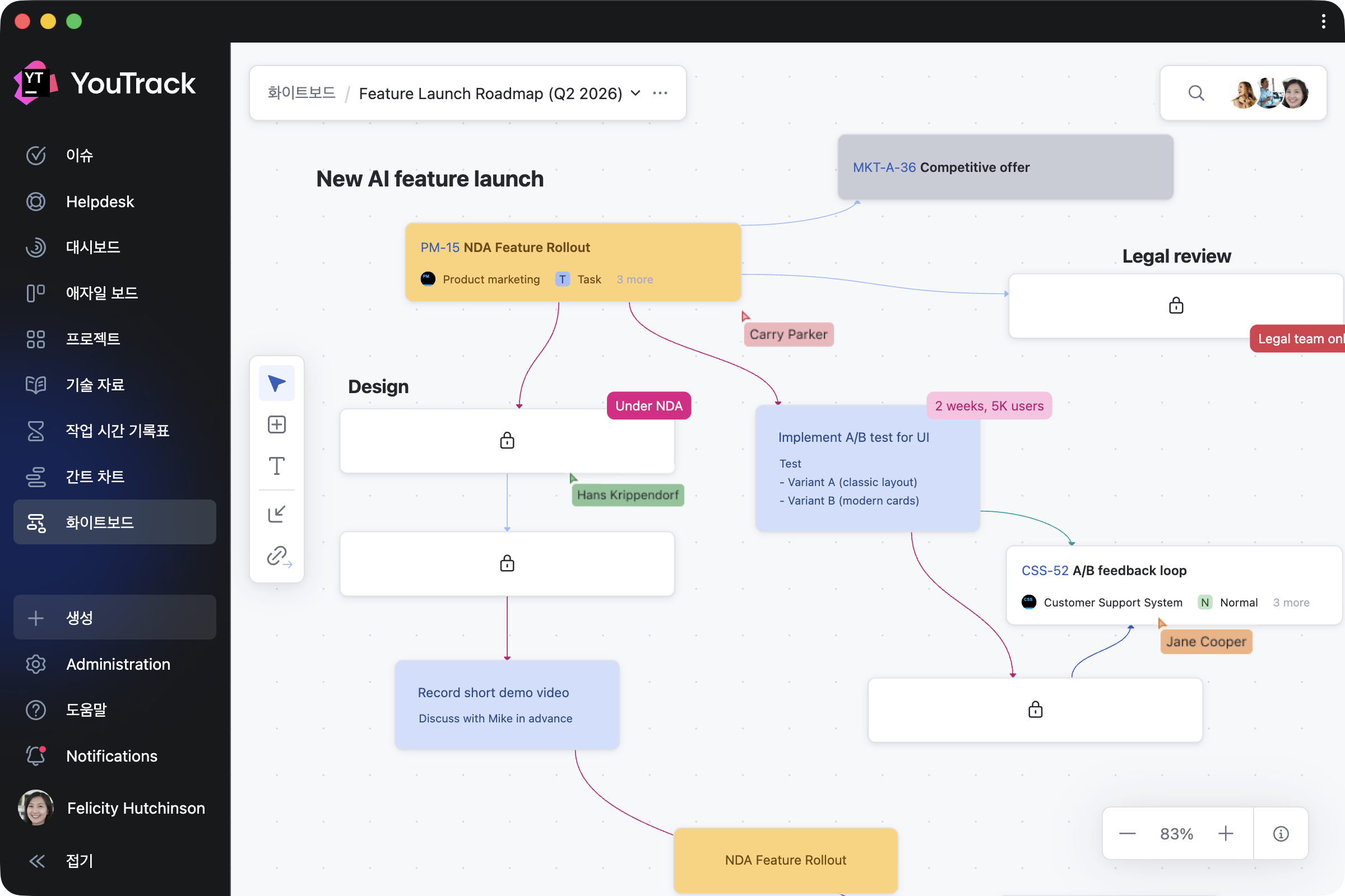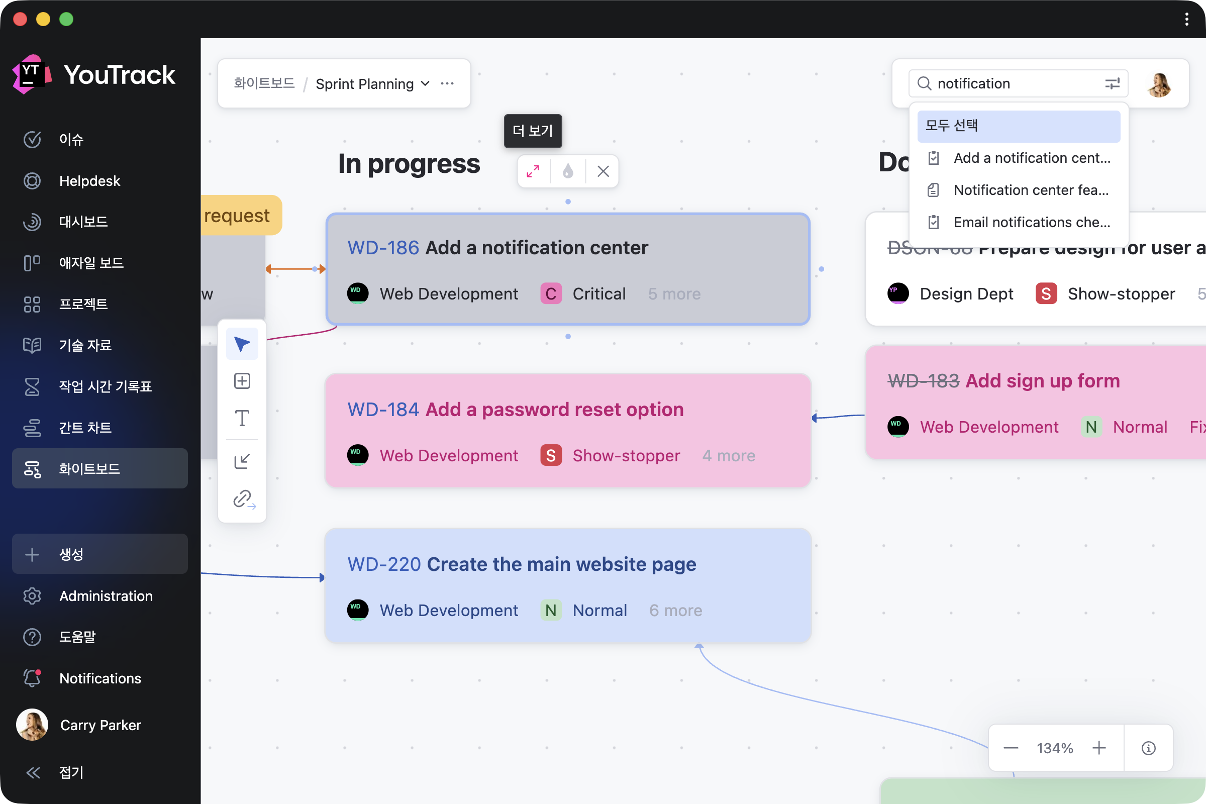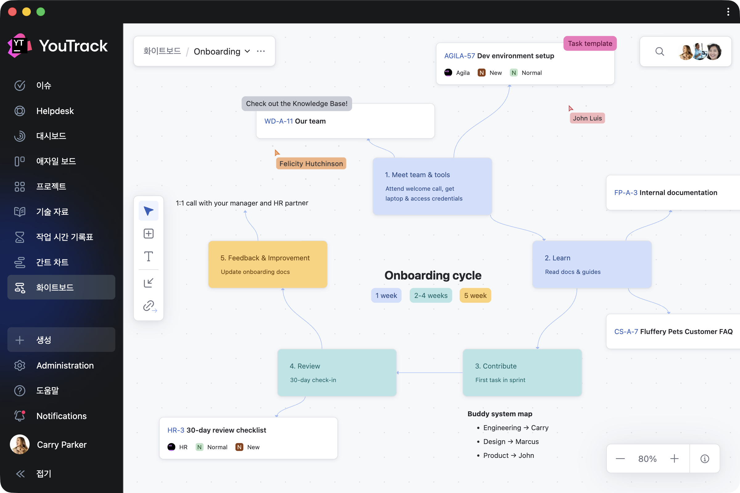 이번에 도입된 화이트보드는 작업을 진행하면서 프로젝트를 시각화할 수 있는 유연한 새로운 공간으로, YouTrack의 기본 기능을 확장하며 모든 사용자와 헬프데스ㅌ상담원에게 제공됩니다.