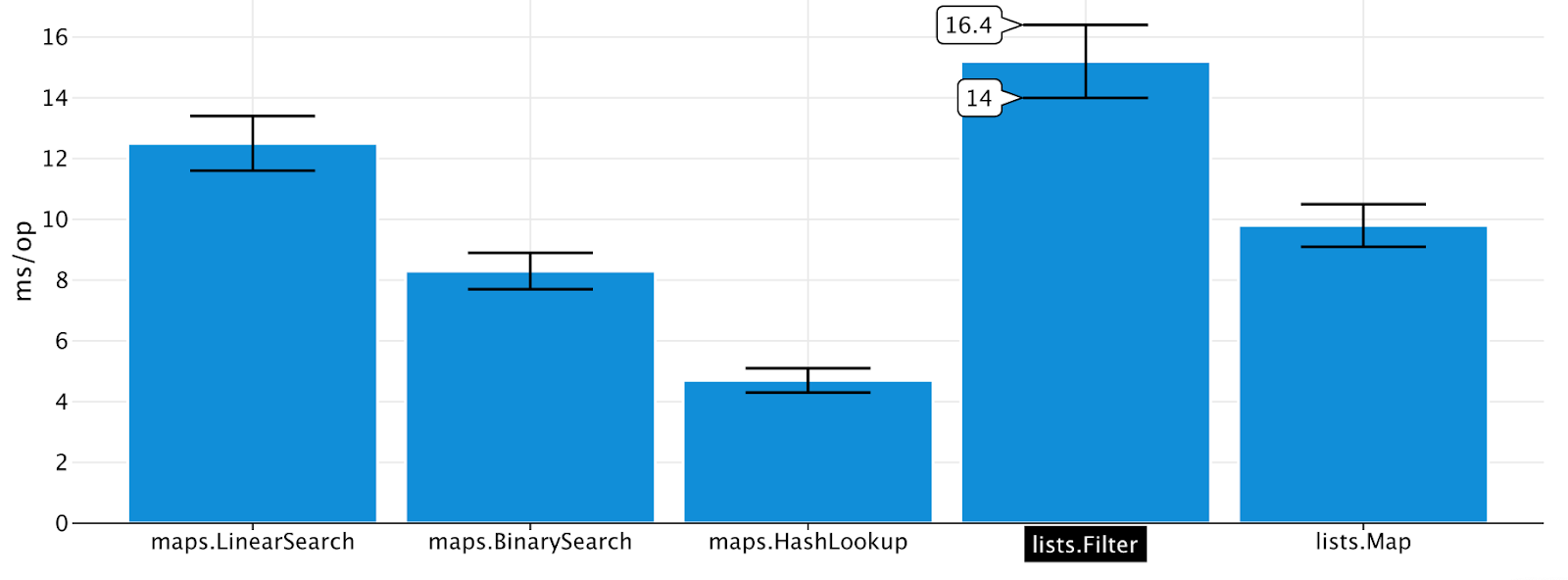 The table works fine for a quick look, but once you accumulate more data, it becomes harder to navigate. Visualizing the same data gives you an instant overview of which implementations perform better and how stable the results are.
