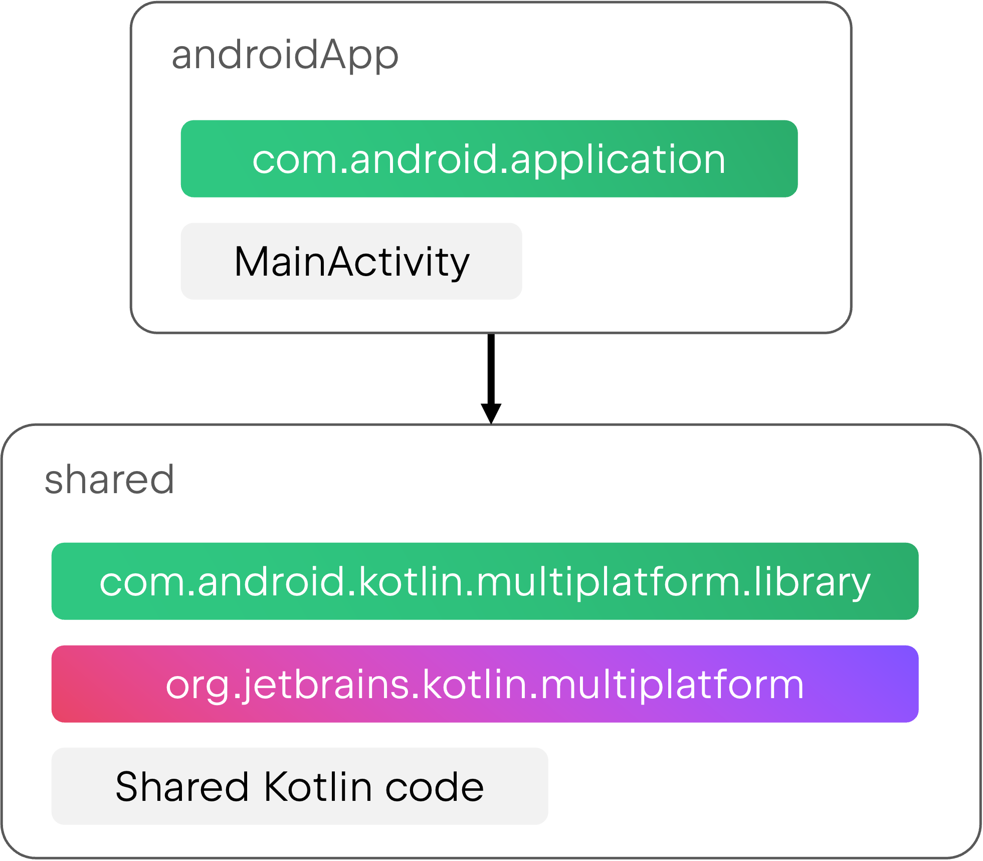 Then, this new application module should depend on the existing multiplatform module to have access to its contents. The multiplatform module can now become an Android library, which means you should migrate it to the new Android KMP library plugin.
