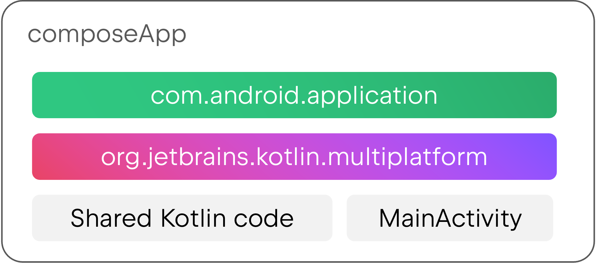 Many projects apply both the Android application plugin and the Kotlin Multiplatform plugin in the same module. A module like this contains shared multiplatform code as well as an Android application with all of its related build configuration. This was the recommended structure in the past, and if you created your project using the KMP wizard, your project probably has a single composeApp module that’s set up like this.