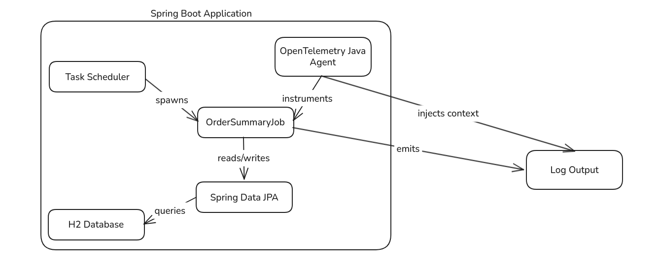 The application consists of a Spring Boot Service running in a single Java Virtual Machine (JVM). The Task Scheduler triggers the OrderSummaryJob at regular intervals. The job reads orders from an embedded H2 database via Spring Data JPA, processes them, and writes summaries back to the database. The OpenTelemetry Java Agent sits within the JVM, automatically instrumenting the job and injecting trace context into the Mapped Diagnostic Context (MDC). This context flows through the log output, allowing you to correlate all logs from a single execution when multiple executions run concurrently.
