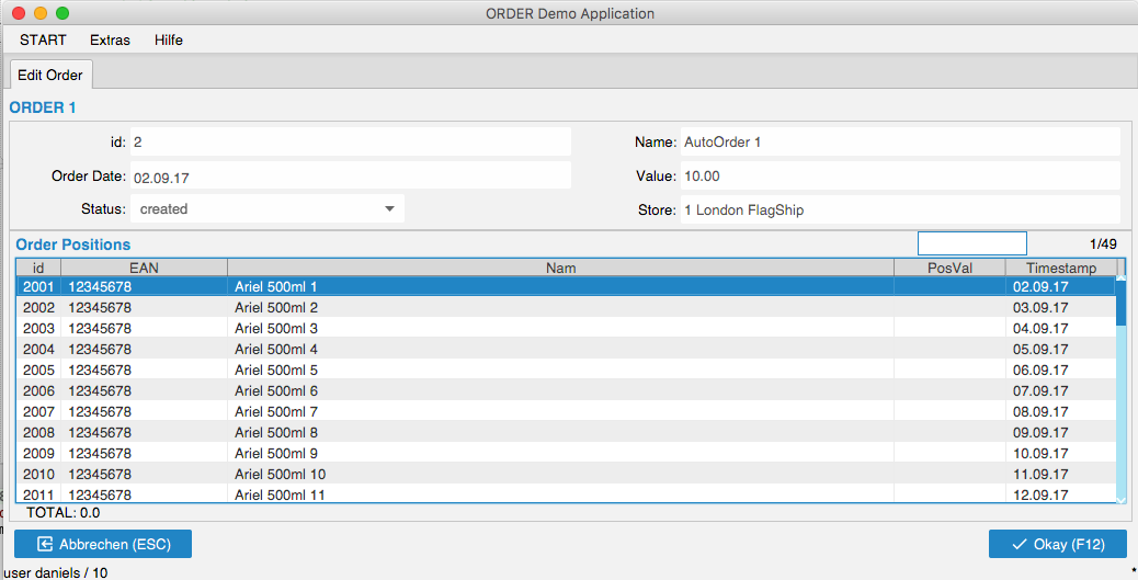 Screenshot 1: Demo-Application UI with one Order containing multiple Order-Positions.
