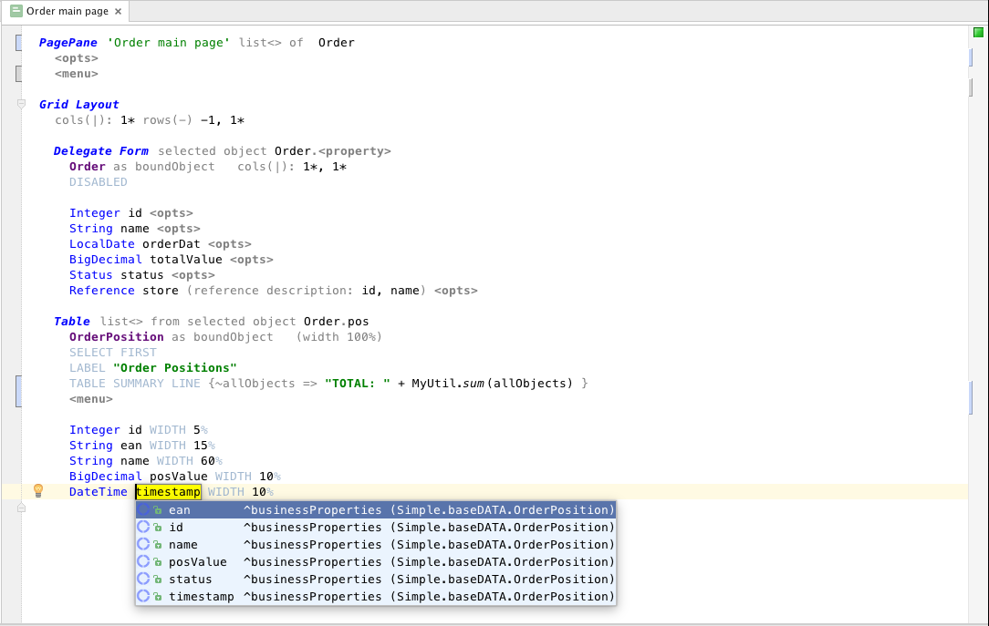 When specifying UI elements with the DataUx language, users can reference declared Java objects and their properties, as long as they are loaded and available in the IDE. Smart scopes for class references, properties or selections are calculated while editing. As seen on screenshot 2, the DataUx option “Table Summary Line” provides a closure-similar concept with a variable labeled as “allObjects” (the type would be list<OrderPosition>). To the right, the option is expecting a Java expression returning a string (type Java.lang.String). In our example here, the static method sum() from the MyUtil class is called. Though, in the context of this option, any valid Java expression is possible, starting from method calls over string concatenations to Java variable references. Smart scopes for all references are calculated specifically in the option’s context. All expressions are type checked.