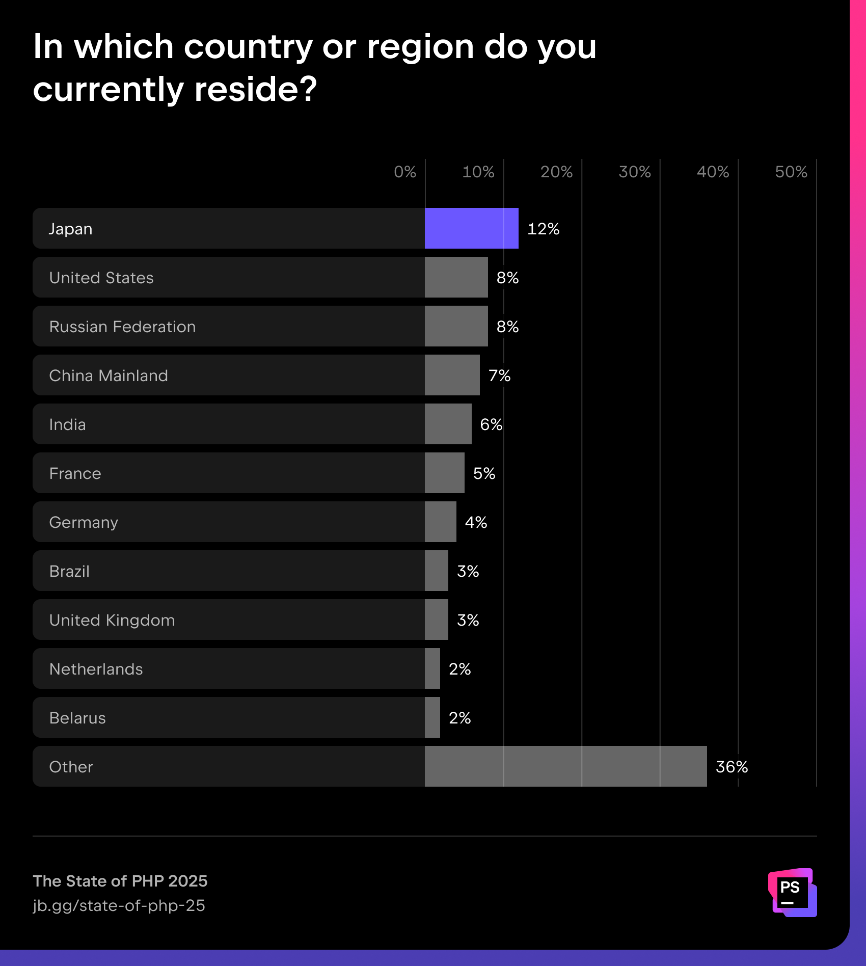 This year, we collected responses from 1,720 developers who indicated PHP as their main programming language, with the largest populations living in Japan, the United States, Russia, China, and France.