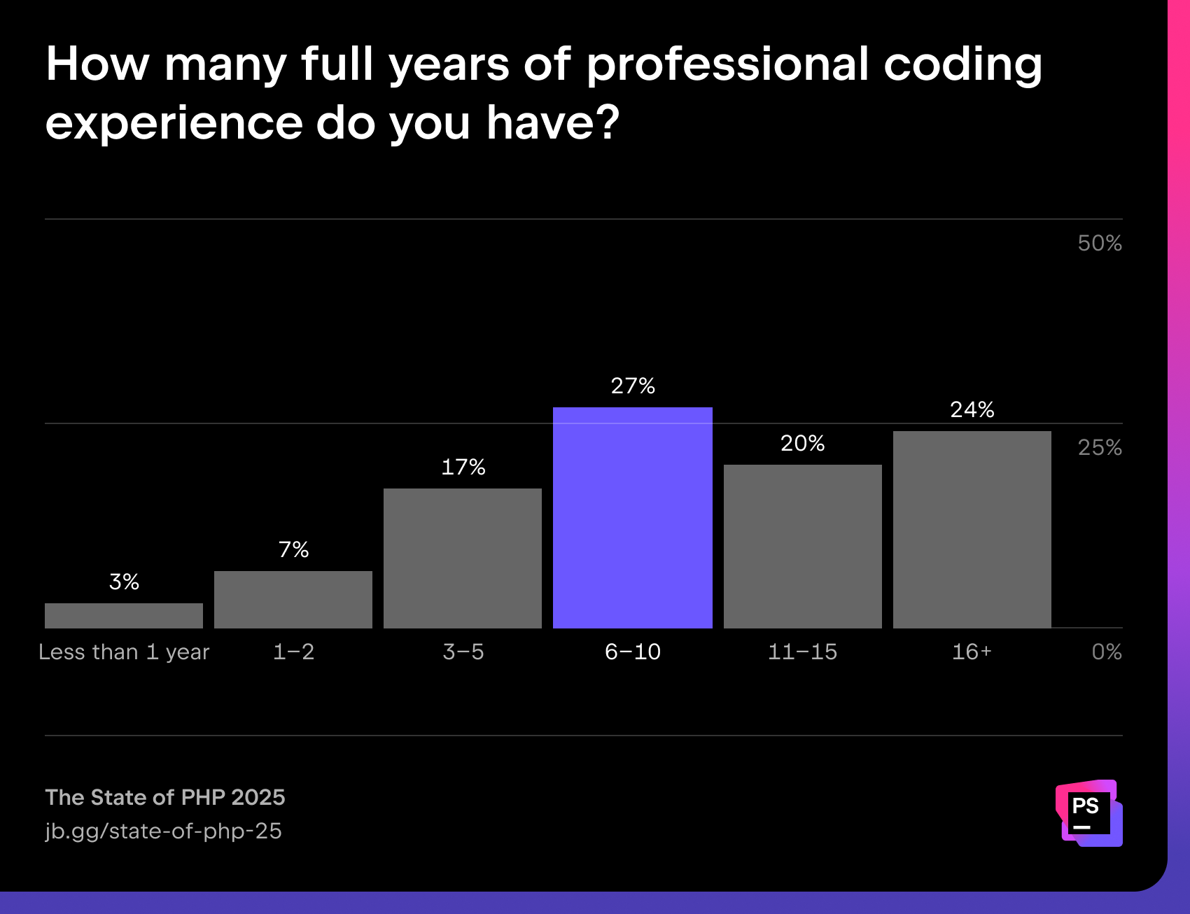 88% of PHP developers have more than three years of experience, with the largest single group falling in the six-to-ten-year range.