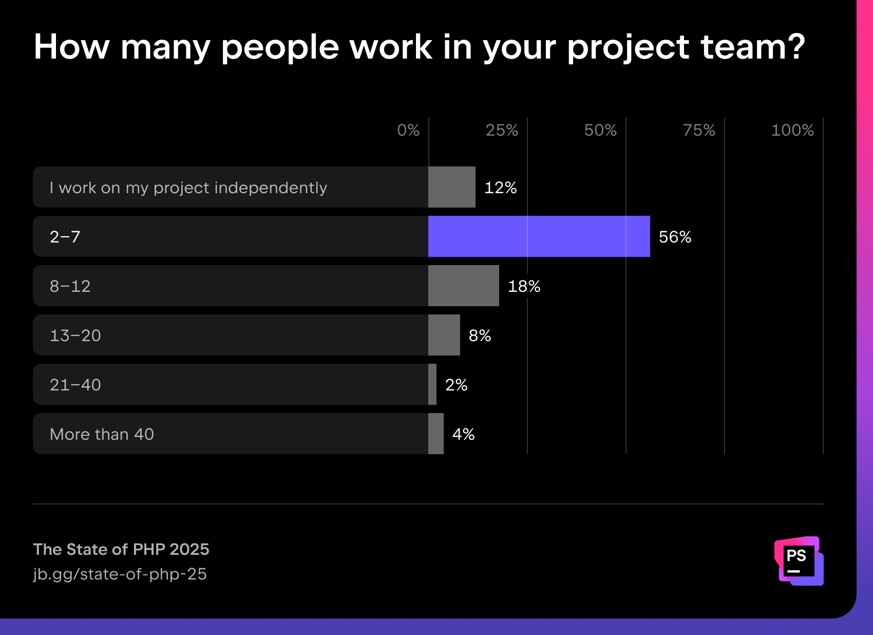 More than half of PHP developers (56%) work in small teams of two to seven people, while 12% work independently.
