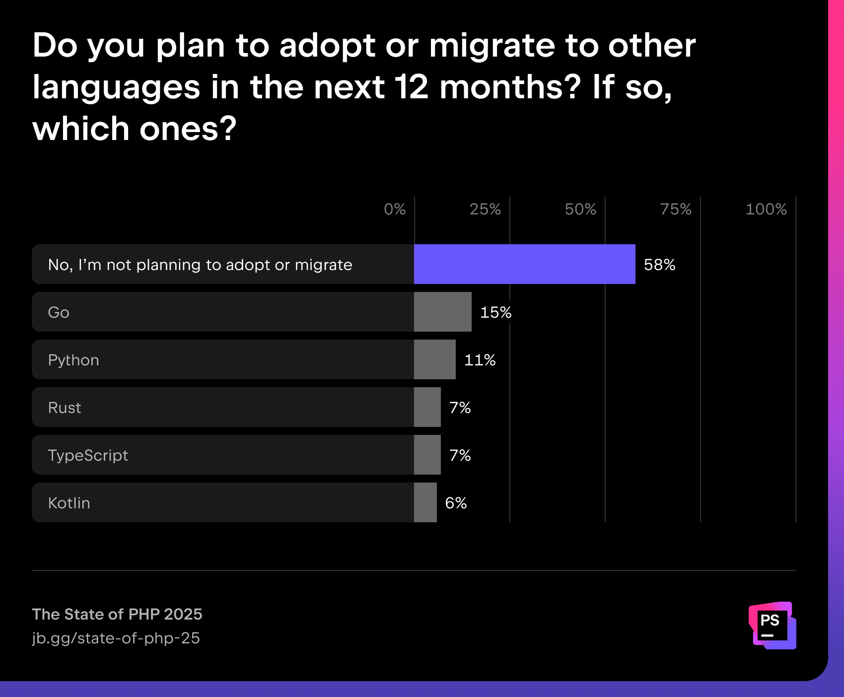 The majority of PHP developers (58%) do not plan to migrate to other languages in the next year. For those who do, Go and Python are the most attractive alternatives.