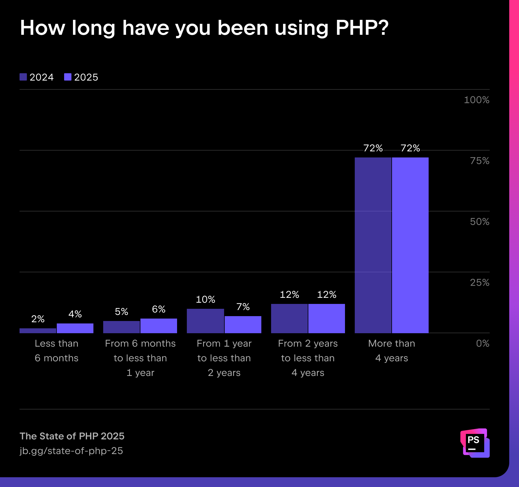 The share of newcomers is slowly growing: 4% have been using PHP for less than six months (up from 2% last year), and 6% for less than one year. Still, almost three-quarters (72%) of developers report over four years of PHP usage, underlining the ecosystem’s maturity.