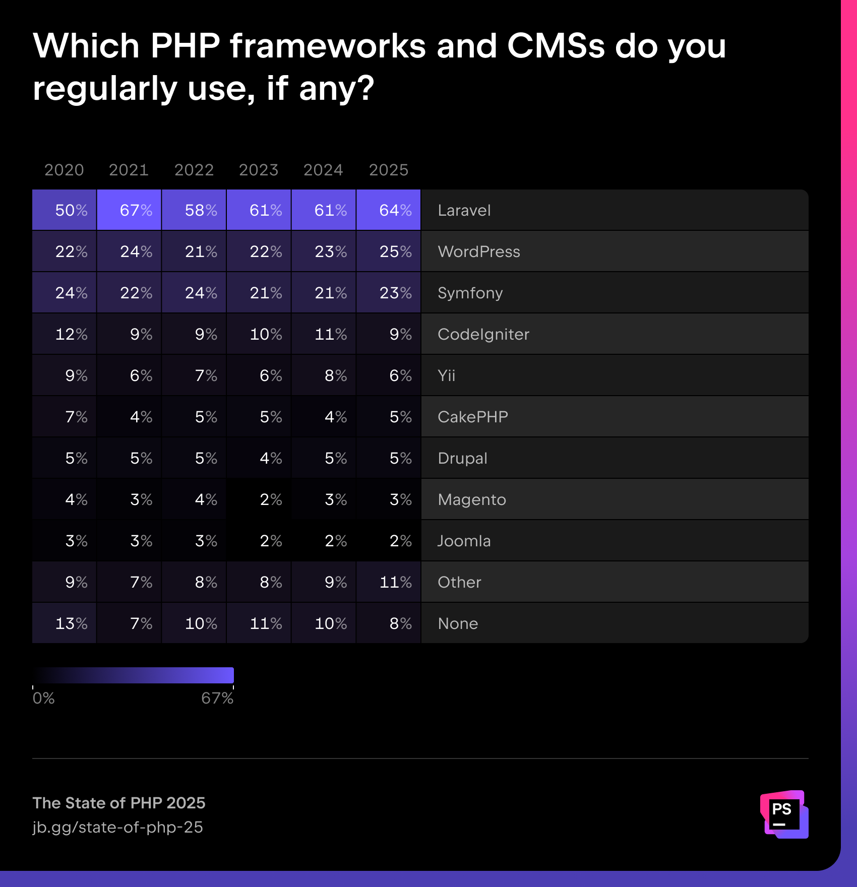 No major shifts occurred in framework adoption: Laravel continues to lead with 64% usage, followed by WordPress (25%) and Symfony (23%). Other frameworks like CodeIgniter, Yii, and CakePHP hold smaller but stable shares.