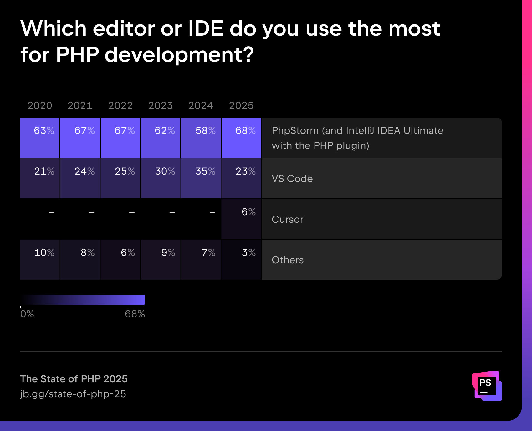 One of the most striking changes is in tooling: The share of those using either PhpStorm or IntelliJ IDEA with the PHP plugin has gone up by 10 percentage points, to 68%. Visual Studio Code’s share has dropped to 23%, while new players like Cursor (6%) have also entered the scene.