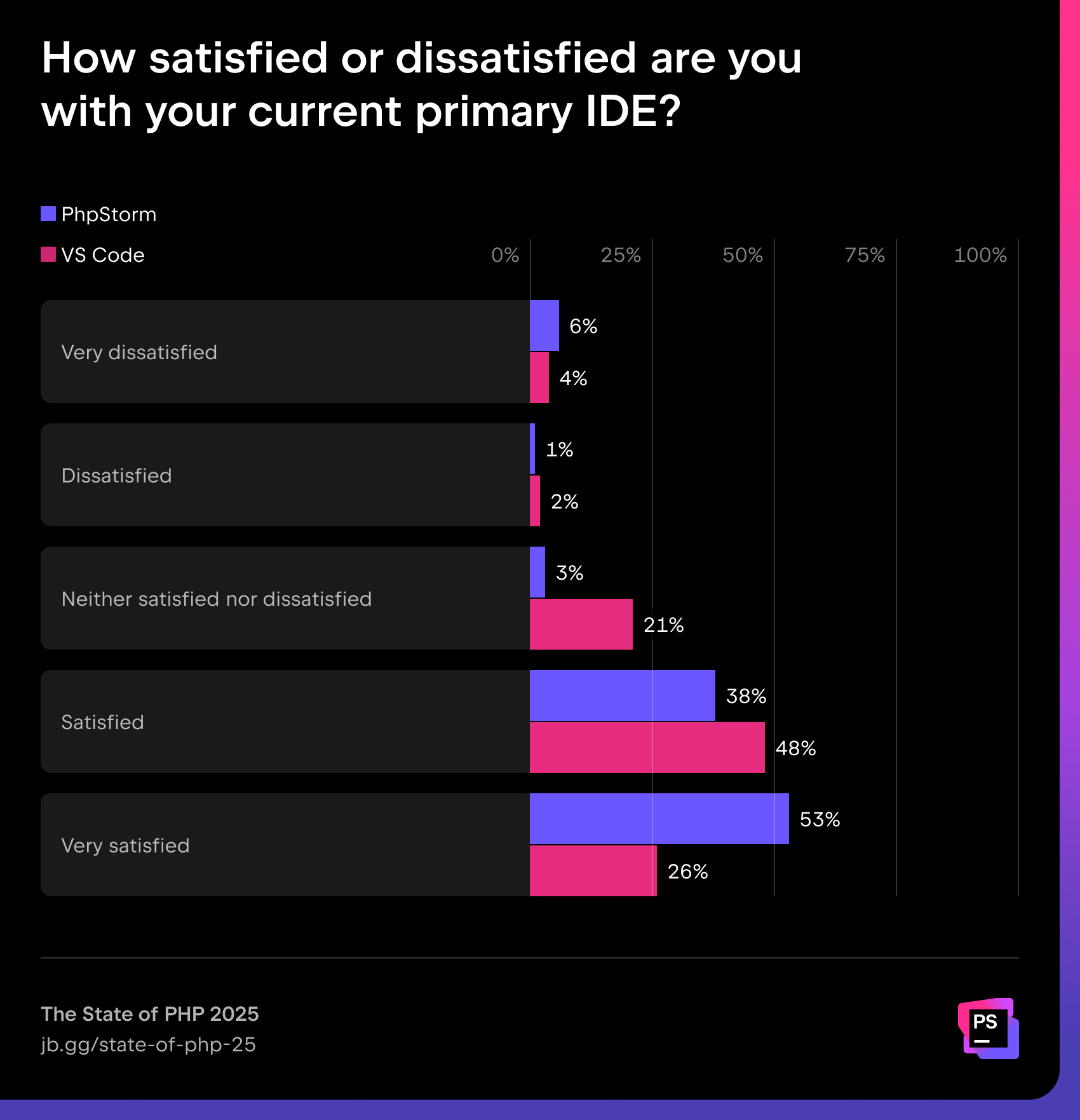 We also asked PHP developers how satisfied they are with their primary IDE. Among them, 53% of PhpStorm users gave their IDE the highest possible rating, compared to just 26% of VS Code users.