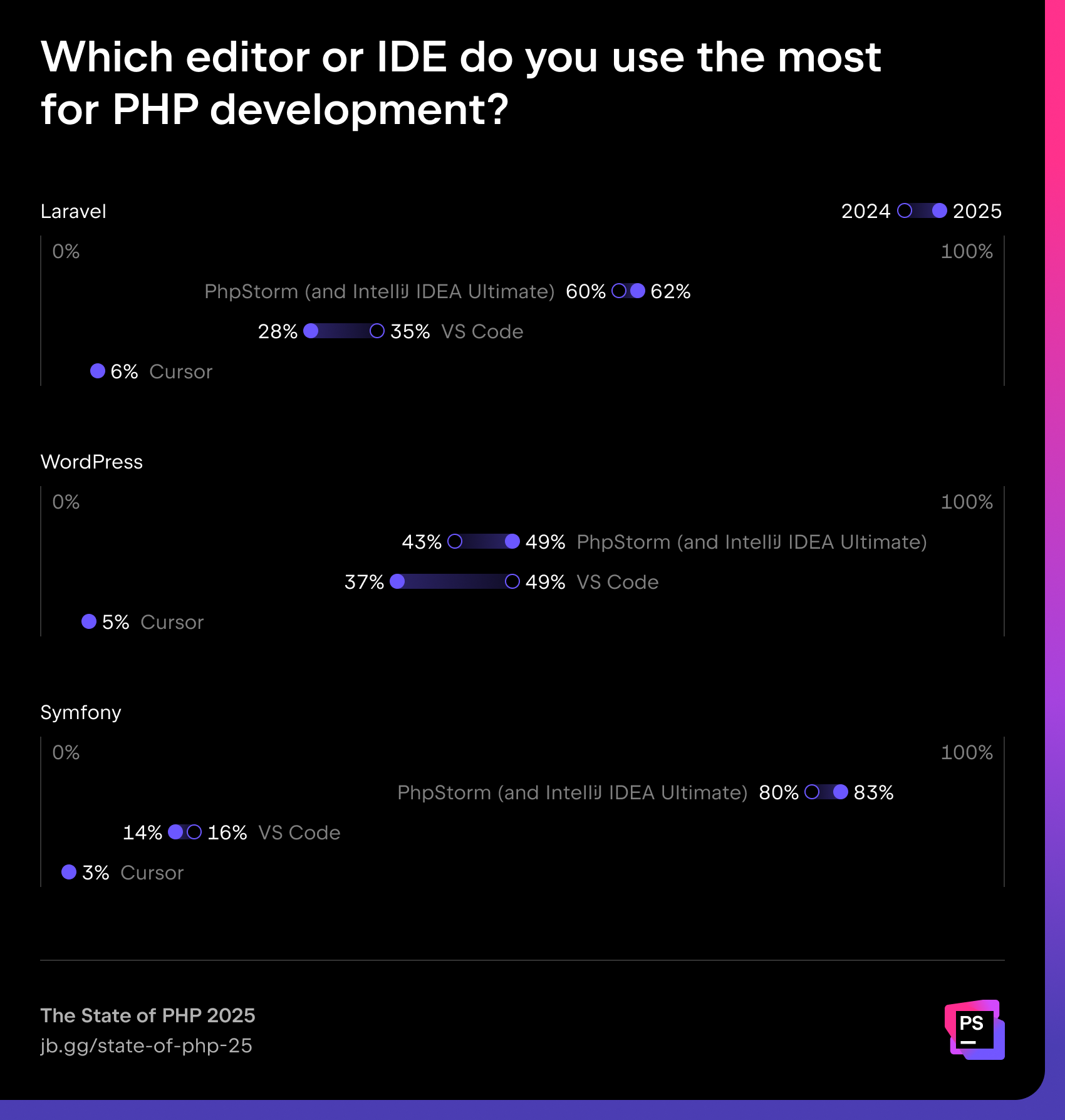 PhpStorm dominates in Symfony (83%) and leads in Laravel (62%), while WordPress developers remain more split, with VS Code remaining a popular choice (37%).