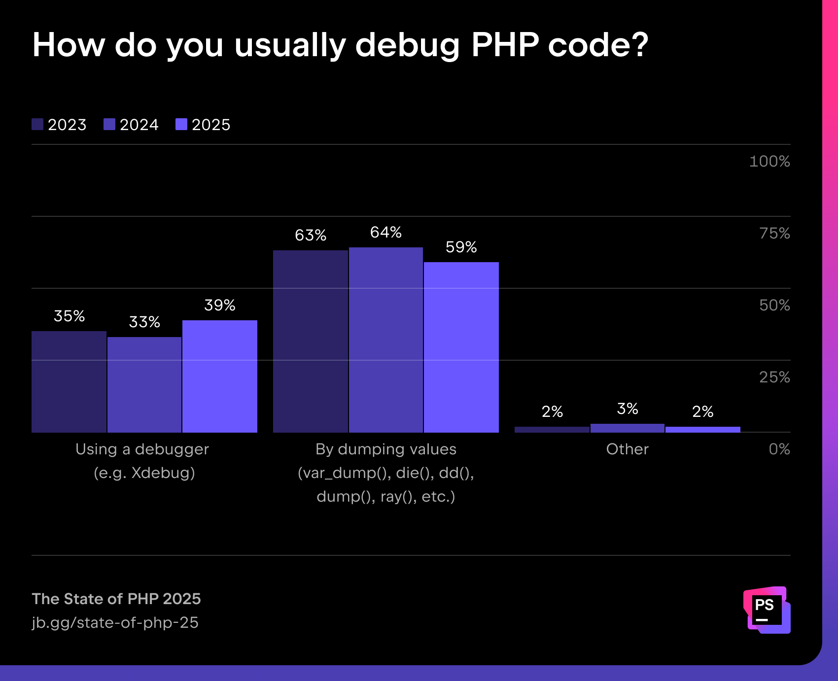 When it comes to debugging, most developers still rely on var_dump-style approaches (59%), though debugger adoption (e.g. Xdebug) has risen slightly to 39%.