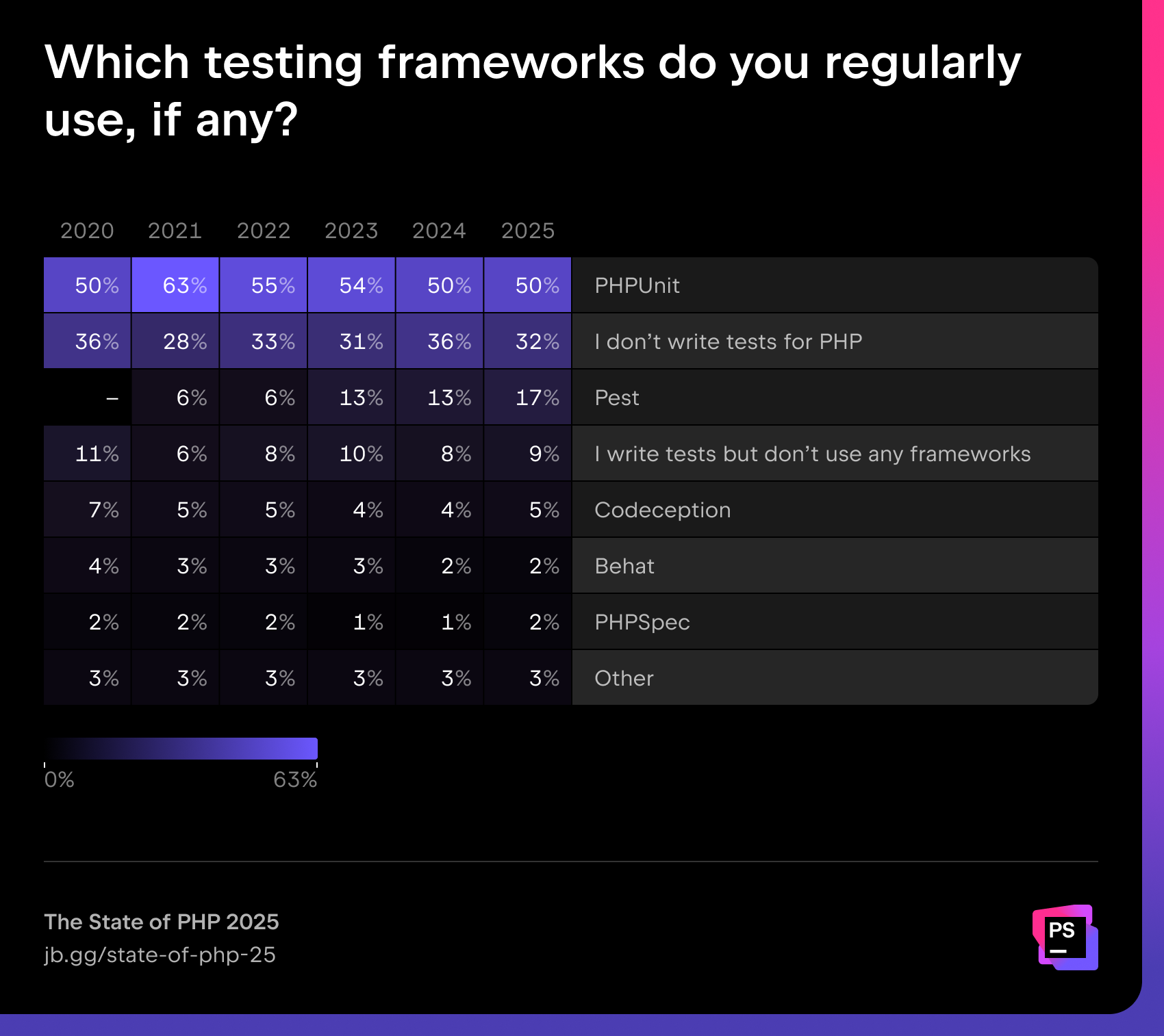 PHPUnit (50%) remains the standard, but Pest adoption has gained four percentage points to reach 17%, showing momentum toward modern, developer-friendly testing frameworks.