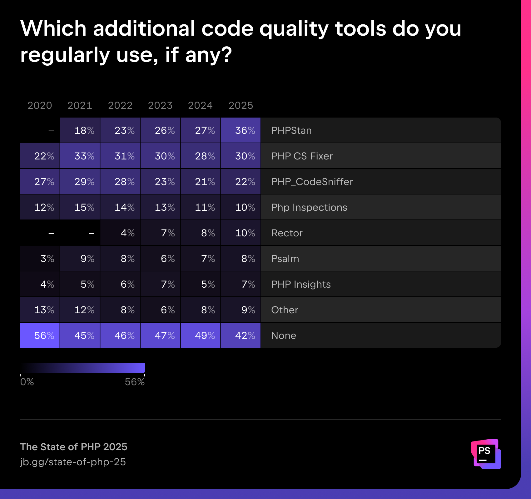 The clear winner in 2025 is PHPStan, which jumped to 36% usage, up nine percentage points from last year. Tools like PHP CS Fixer (30%) and PHP_CodeSniffer (22%) remain widely used, while Rector (10%) continues its steady rise. Still, 42% of respondents don’t use any code quality tools regularly, leaving room for further improvement.
