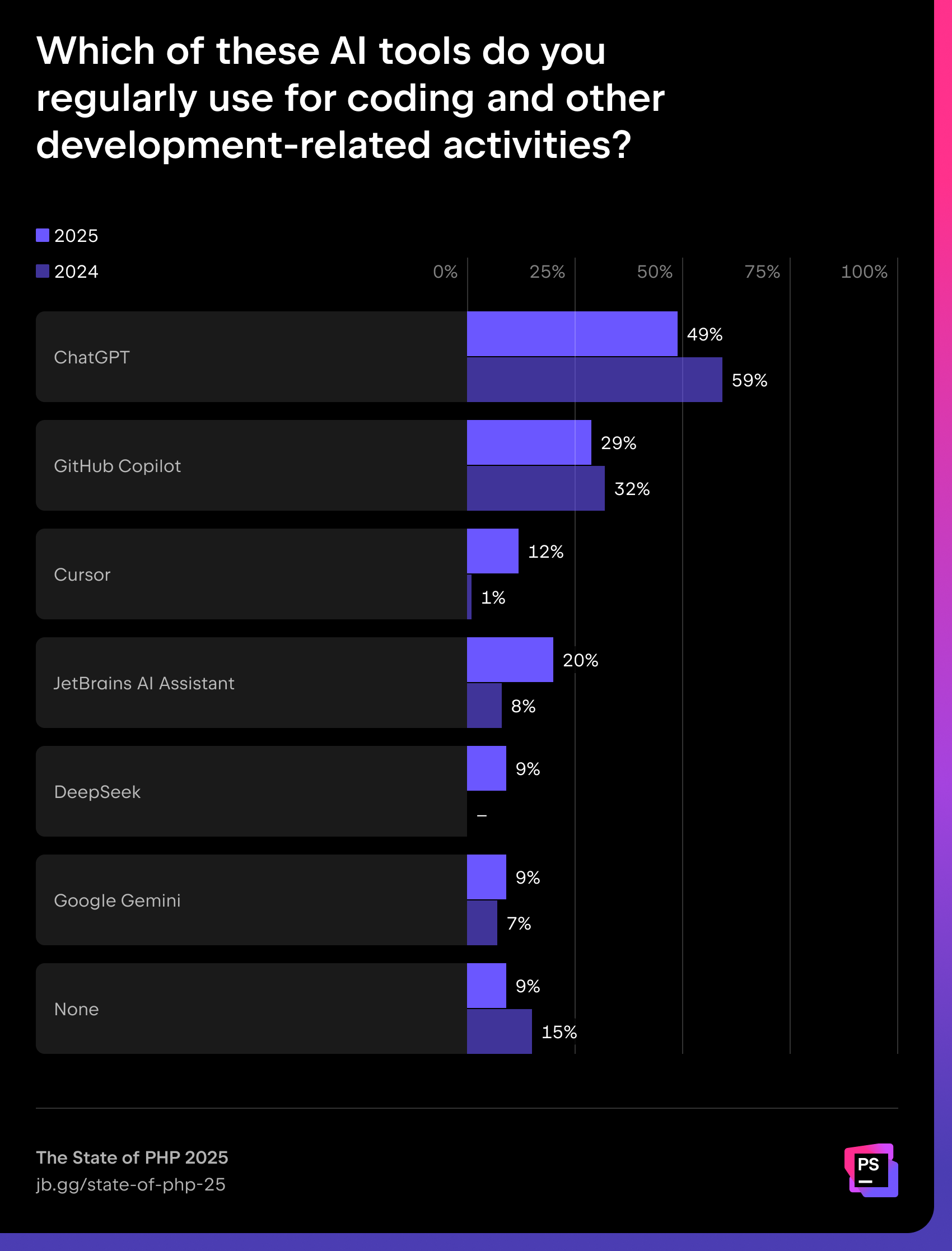ChatGPT leads daily use with 49%, though its share has dropped since 2024. GitHub Copilot (29%) and JetBrains AI Assistant (20%) follow, with the latter tripling its adoption since last year.