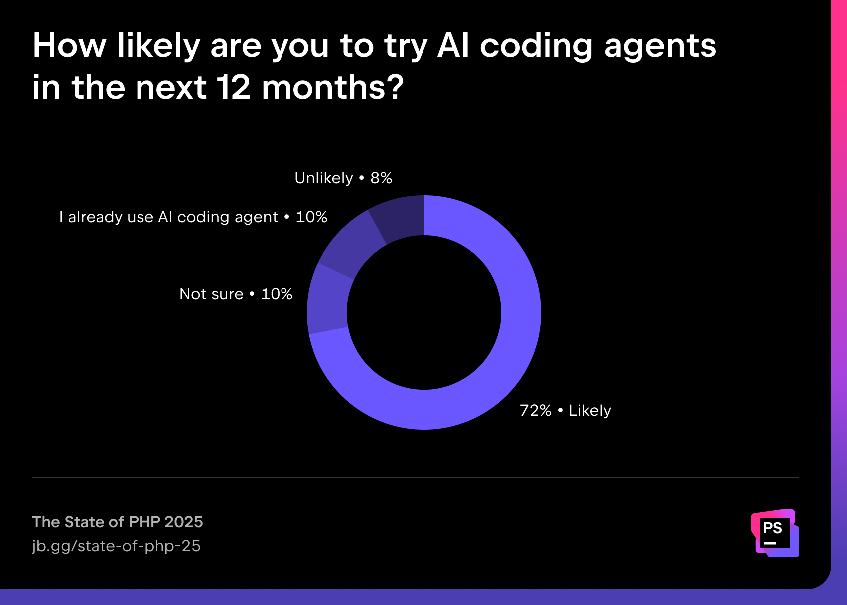 Looking ahead, 72% of respondents are likely to try AI coding agents in the next year, while only 8% say it’s unlikely.