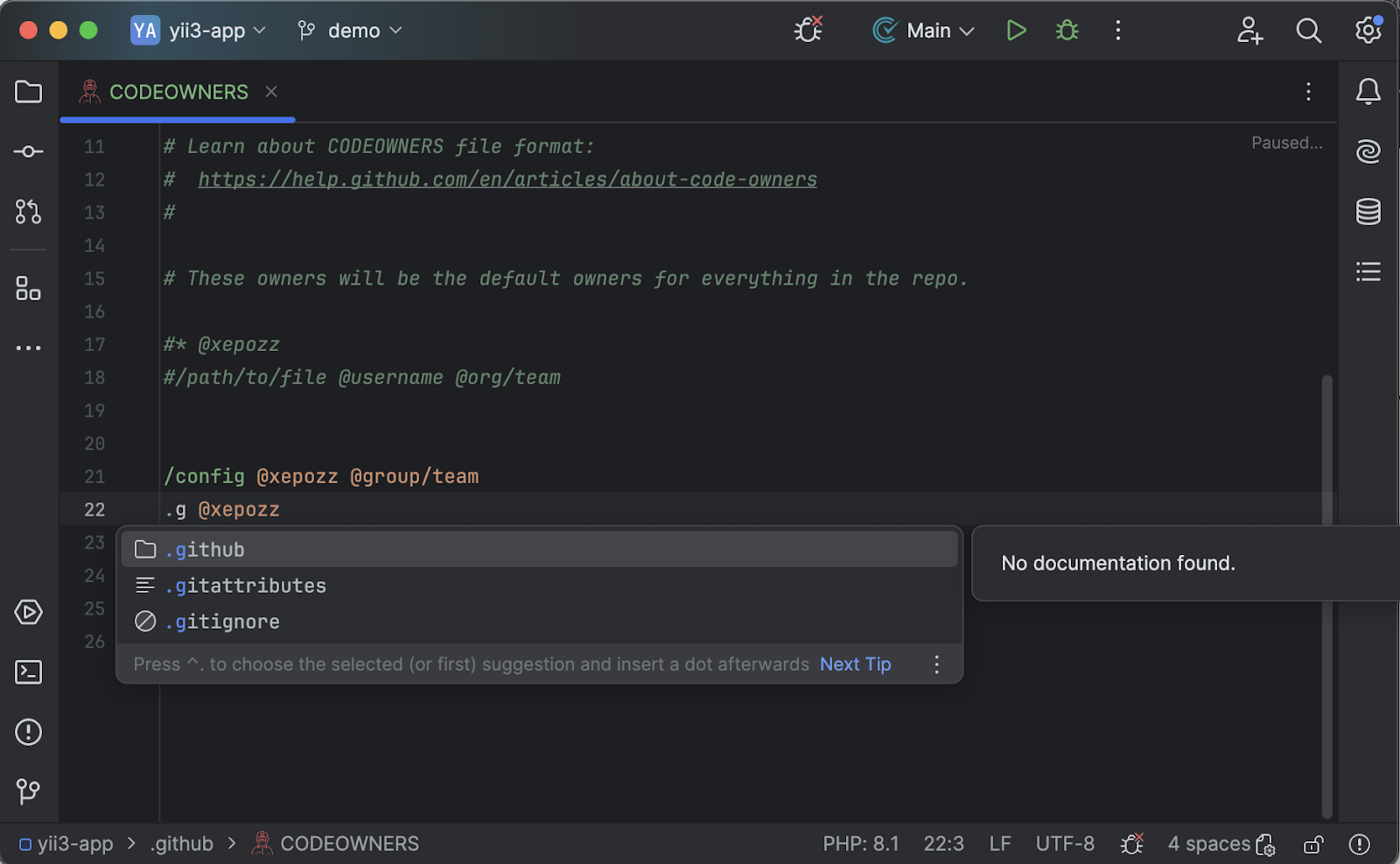 The Git CODEOWNERS plugin makes editing this file painless. It autocompletes file paths, suggests team names, and validates syntax to prevent mistakes before you commit.