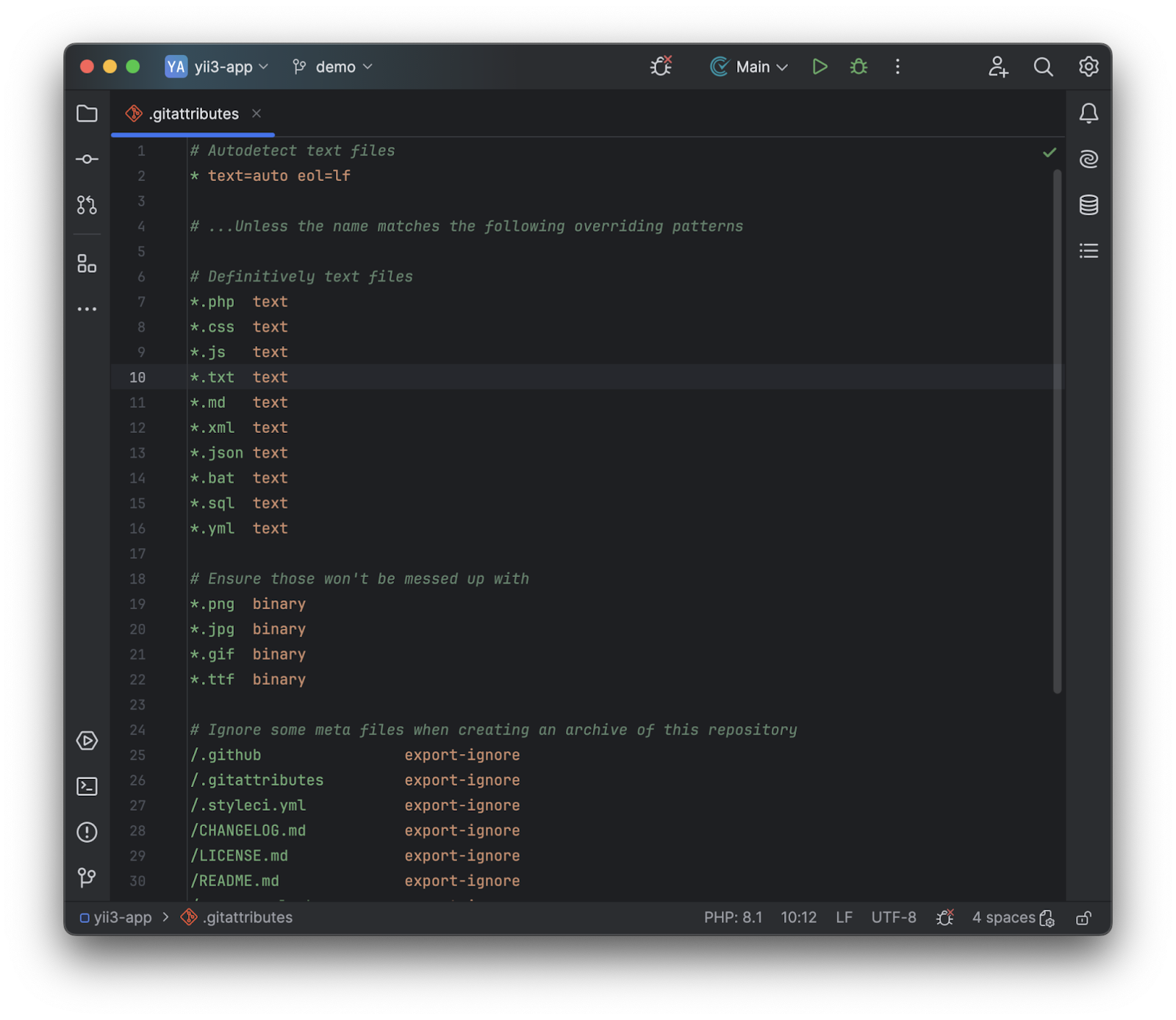 The .gitattributes Support plugin adds first-class editing experience for this file in PhpStorm. It highlights syntax, recognizes attribute rules, and even suggests valid options while you type so you don’t have to look them up each time. Small details, but they make editing smoother and help prevent mistakes.