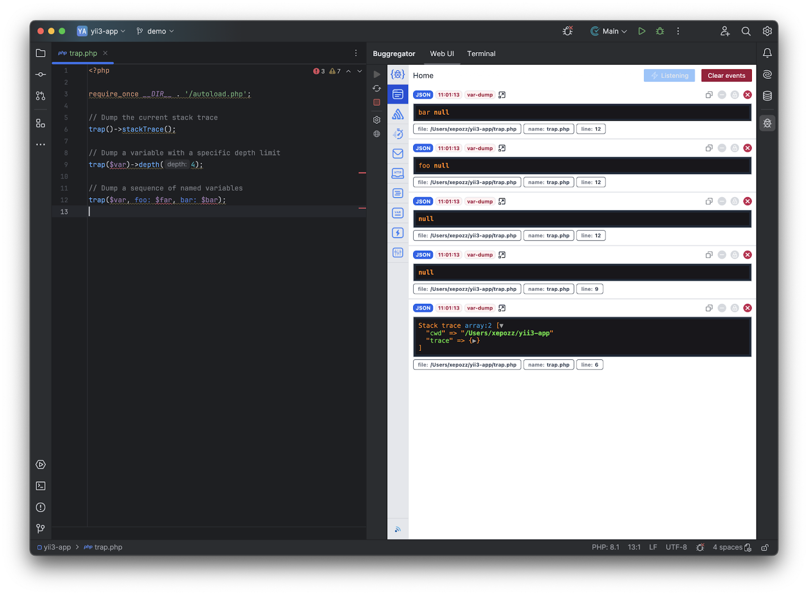 Just call trap() in your PHP code, and the plugin automatically spins up a local server that listens for these calls and renders the data in a docked panel — no browser tabs, no context switching.