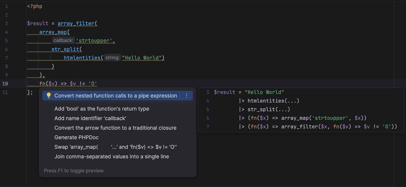 PhpStorm now detects code elements where the PHP 8.5 pipe operator syntax can be used and suggests a quick-fix to convert such code into easier-to-read pipe operator chains.
