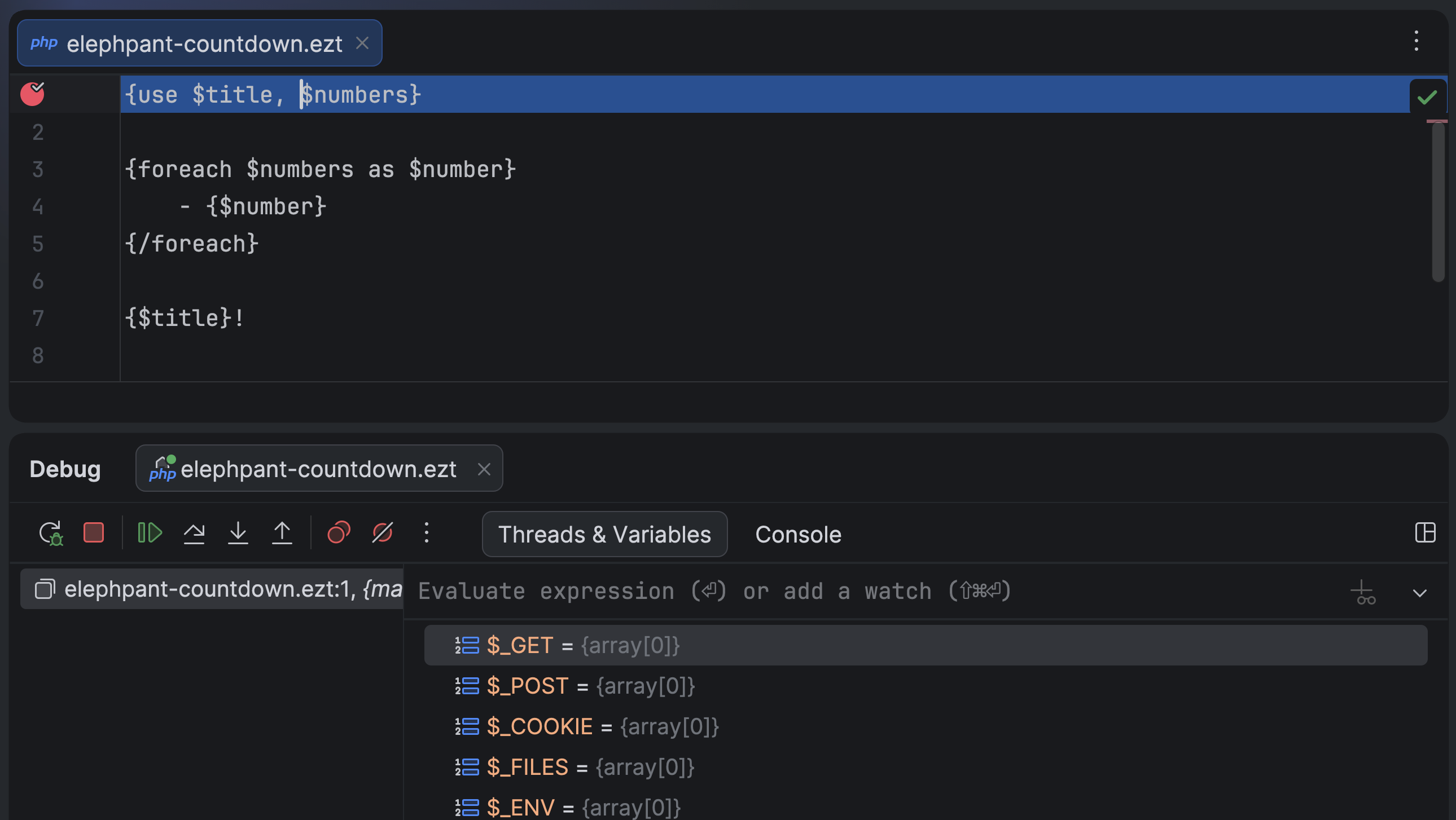 You can now set breakpoints in non-PHP files as soon as the file name pattern is associated with the PHP file type in the IDE settings. Together with native path mapping between templates and compiled PHP files introduced in Xdebug 3.5, this feature allows you to debug source template files of any format, including niche extensions like .ezt.