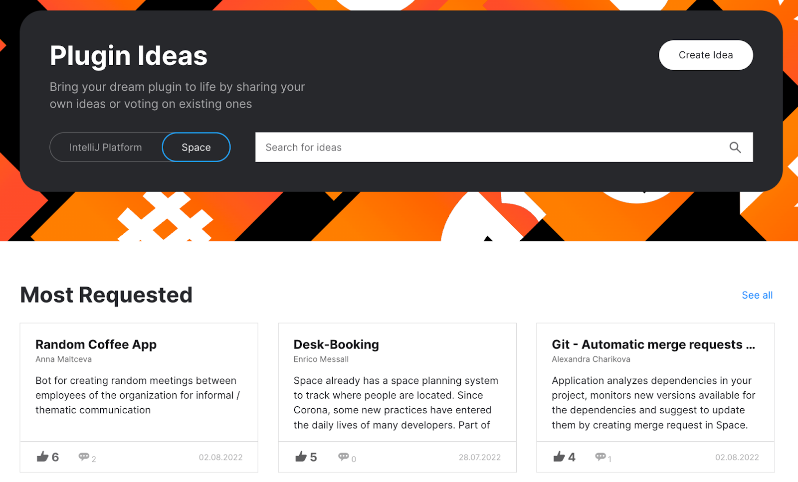The Plugin Ideas page on JetBrains Marketplace is a place for sharing ideas for plugins or new features. At a glance, you can see what the community would appreciate the most and use that knowledge to decide what to work on. It now features ideas for Space applications.
