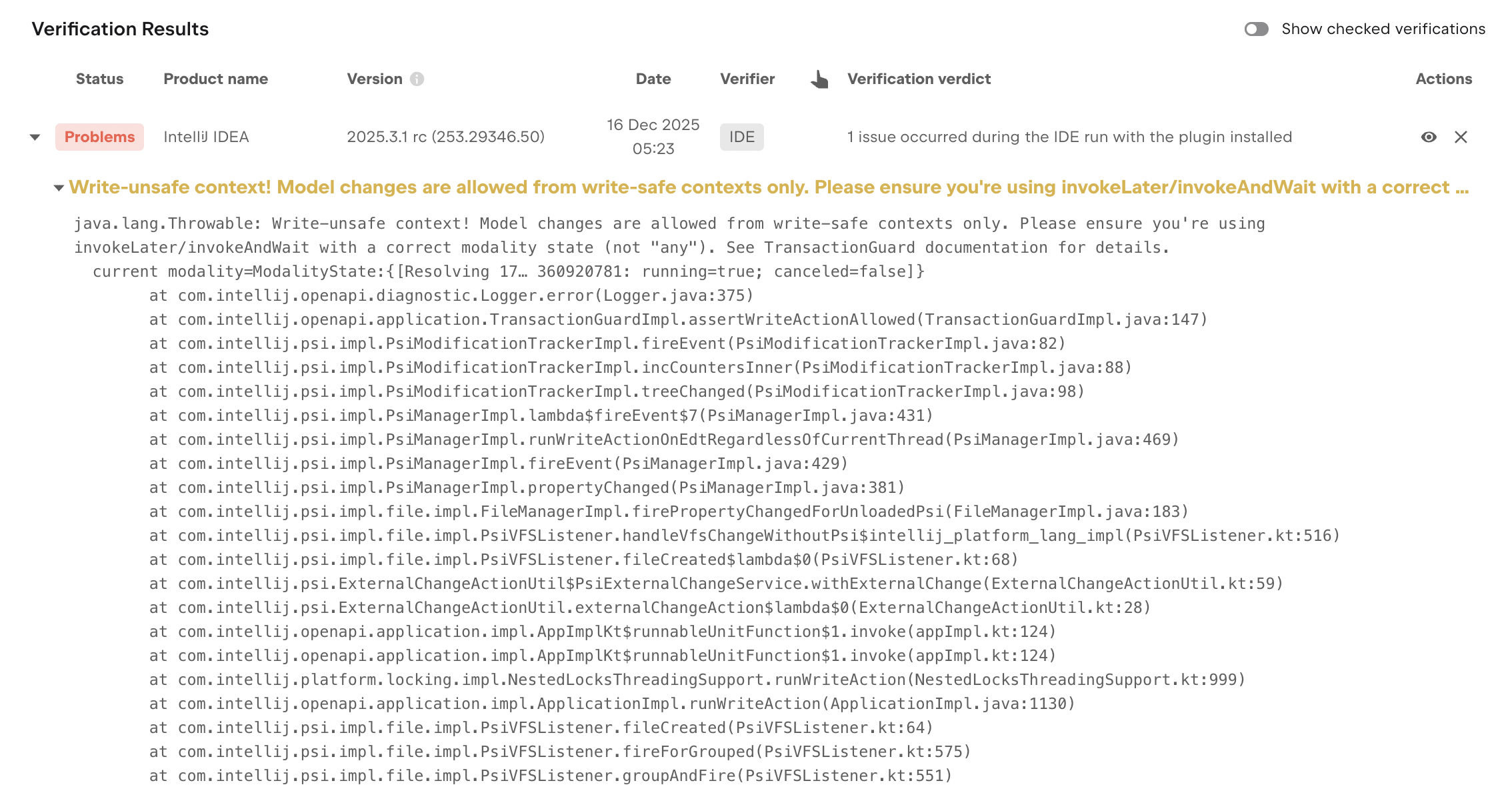 Integration test results are now displayed directly on the plugin page, alongside Plugin Verifier results on the Versions tab. These tests help ensure that a plugin version works smoothly in the IDE and does not cause exceptions. If a test run is unsuccessful, you can open the detailed report to learn more.