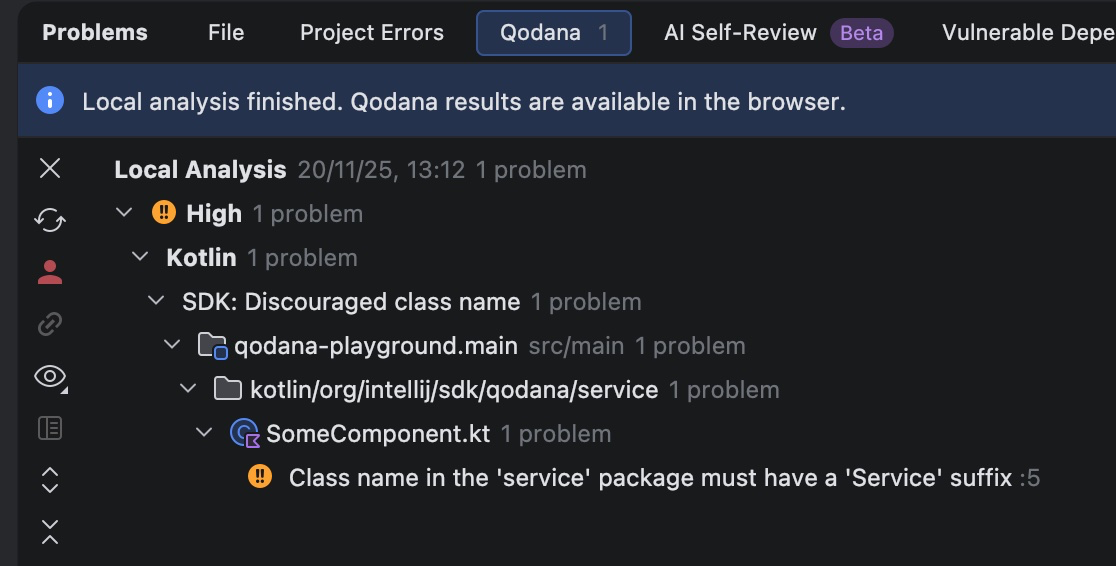 Our playground project should contain a class called src/main/kotlin/org/intellij/sdk/qodana/service/SomeComponent.kt, which does not follow our code convention, as it does not have the Service suffix. There are two ways to integrate the Qodana plugin into Qodana: