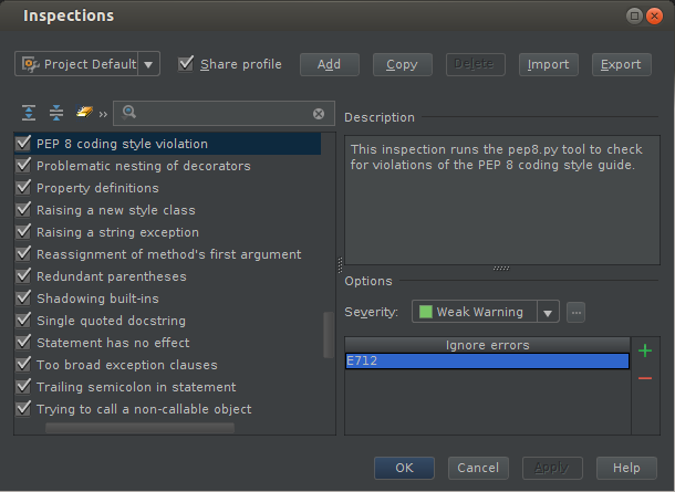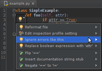 Following PEP 8 is a good practice, although there are some situations where it is desirable to depart from the standard. The PyCharm team respects your freedom of choice, so you can disable specific PEP 8 warnings if you really need to. You can do that with the following quick-fix: