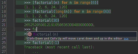 There is a nice standard library module called doctests which lets you document your code and write tests for it simultaneously. Now PyCharm recognizes Python code in your doctests, and provides syntax highlighting and even code insight for it: