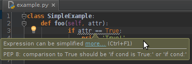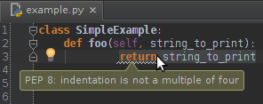 PyCharm 2.7 takes care of readability and general beauty of your code. Now it supports continuous checking of your code for PEP 8 compliance on the fly, as you type it in the editor. PyCharm highlights any coding style violations and gives you suggestions, which you can apply instantly with the well known PyCharm quick-fixes: