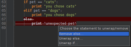 Now PyCharm supports the Unwrap/Remove action for Python, which provides a quick way to remove a control statement surrounding a block of code. To unwrap or remove a statement, place the caret on the expression and press Ctrl+Shift+Delete or go to Code | Unwrap/Remove.