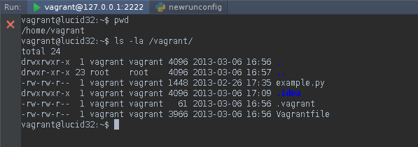 Native Vagrant integration is now implemented in PyCharm 2.7+. It is supported via the plugin Vagrant that comes already bundled with PyCharm. Vagrant integration makes it much easier to provision and manage your VMs, connect to them over the SSH and automatically configure a remote interpreter and an FTP deployment, if you run your development environment in a VM using Vagrant. All this without leaving the IDE!
