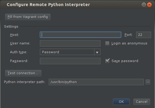 You can fill it manually, as for an arbitrary remote host, or just use “Fill from Vagrant config.” Click it – and voila! All the required fields are filled with your Vagrant box details.
