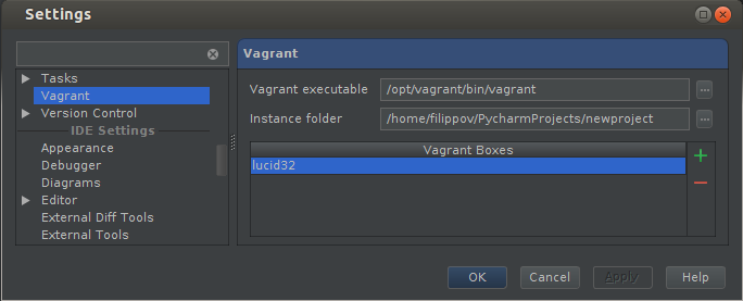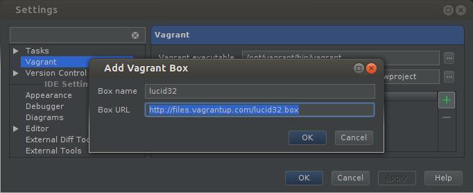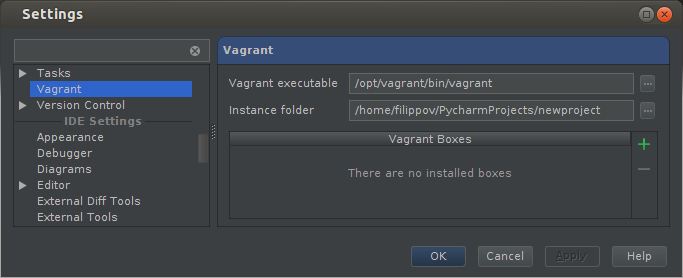 Enter appropriate paths for “Vagrant executable” and “Instance folder,” and then add your first Vagrant Box by clicking the Add (green plus) button: